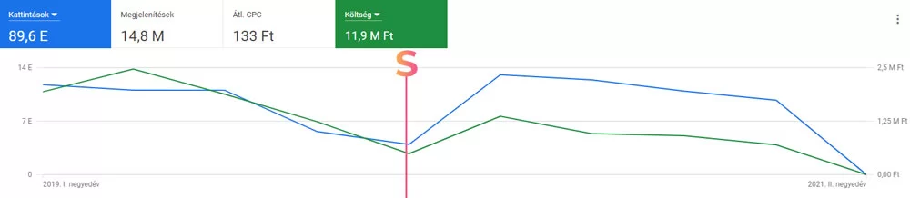 A #02 képen 2020-at 2019-hez hasonlítva jól látszik, hogy a kattintások száma +838-cal nőtt, miközben az elköltött összeg közel a felére csökkent. Ez éves szinten 3.810.000 Ft megtakarítást jelentett.
